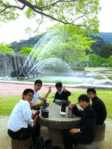 午前中は錦帯橋周辺を散策。着いた早々から、吉香公園で弁当を広げるグループもあったようです。有名なソフトクリーム屋では、わさび味など罰バツゲームのようなソフトクリームの数々に笑顔がこぼれていました。