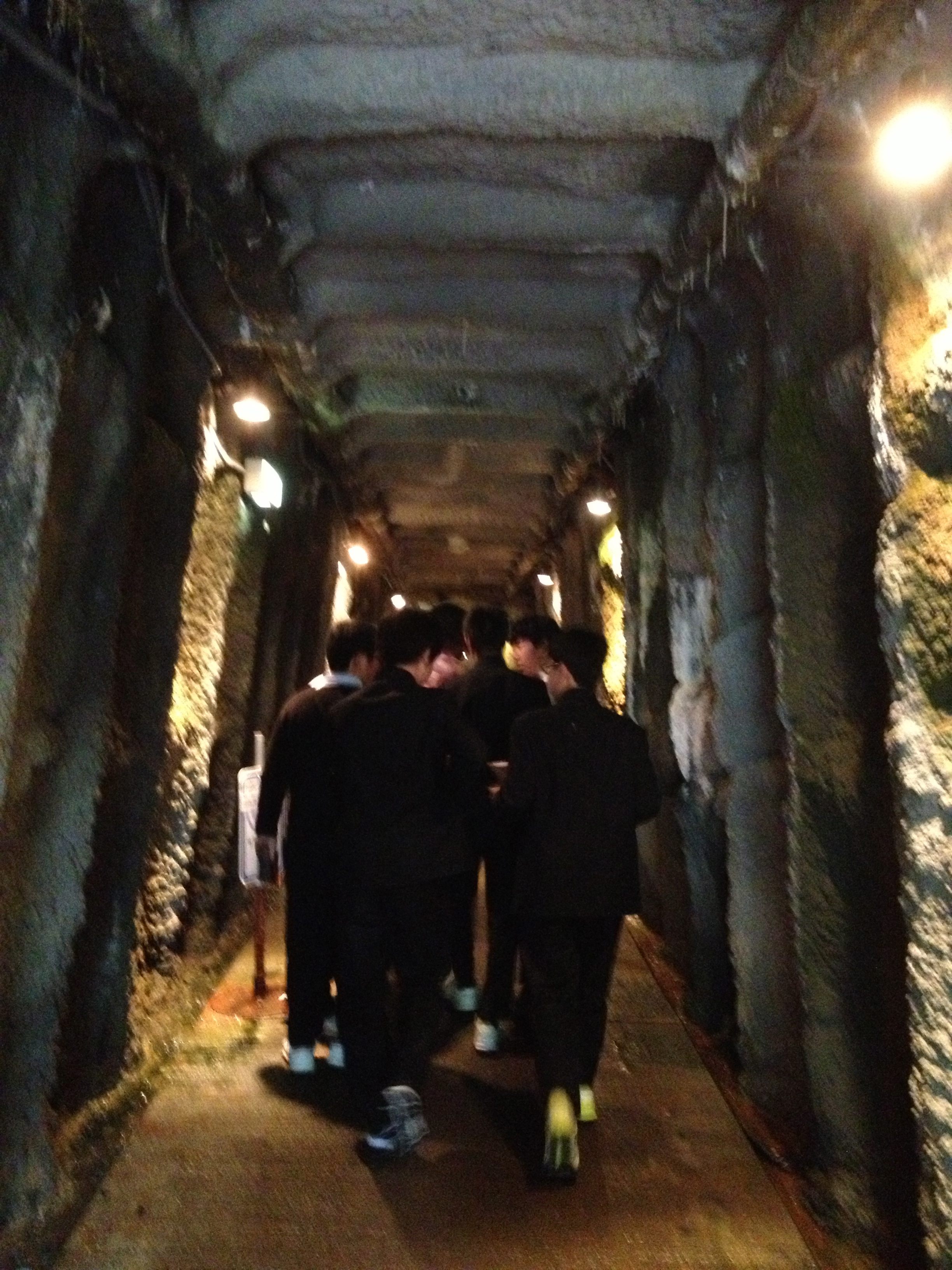 午後は美川ムーバレーに。かつてのタングステン鉱山の坑道を利用したテーマパークです。坑道でゲームを楽しんだ後には砂金取りに挑戦する生徒たちの姿が見られました。