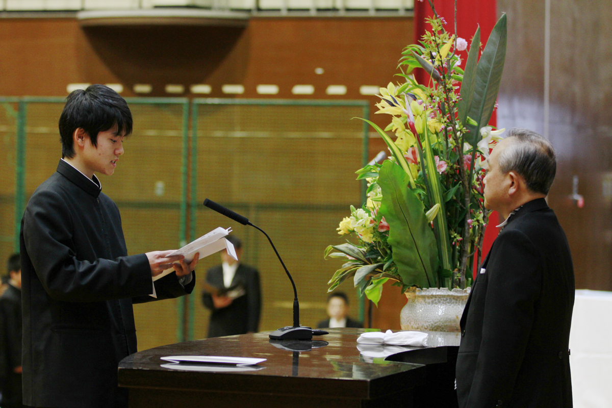 学校までの坂道を彩っていた満開の桜の花びらを散らす激しい雨の中、中学校第56回、高等学校54回入学式を挙行しました。入学許可宣言、校長式辞に続いて、高校1年生の立川 雄介君が、中学1年生183名と高校1年生210名を代表して宣誓しました。