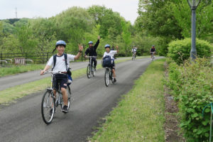 中学2年生は,国営備北丘陵公園に行きました。広大な公園で,自転車に乗ったり,アスレチックを楽しんだり,みんなこの日は勉強のことを忘れ,開放感に満ちあふれた顔で遊んでいました。クラス内のみならず,学年で親ぼくを深めることができました。(D組 川野晴人,E組 近藤悠介)