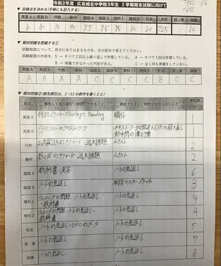 中3ではLHRの時間を使って、①各教科の目標点数、②目標点数に達するための取り組みを紙にまとめています。