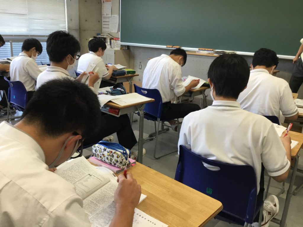 本日のロング・ホームルームでは,先週末に受験した模試の自己採点と復習をしました。特に地歴や理科のテストでは,この夏休みに勉強した分野において正解率が高くなっている様子でした。難解な英文と格闘する生徒もいれば,国語の自分の解答がどのようにしたら正答となるのか熟慮している生徒もいました。理系のクラスでは,数学の問題を解くのに没頭している姿が多くありました。