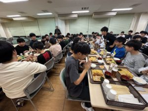 夕食はブッフェ形式。おかわりの列が長く続きました。