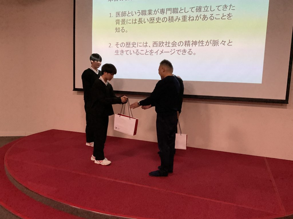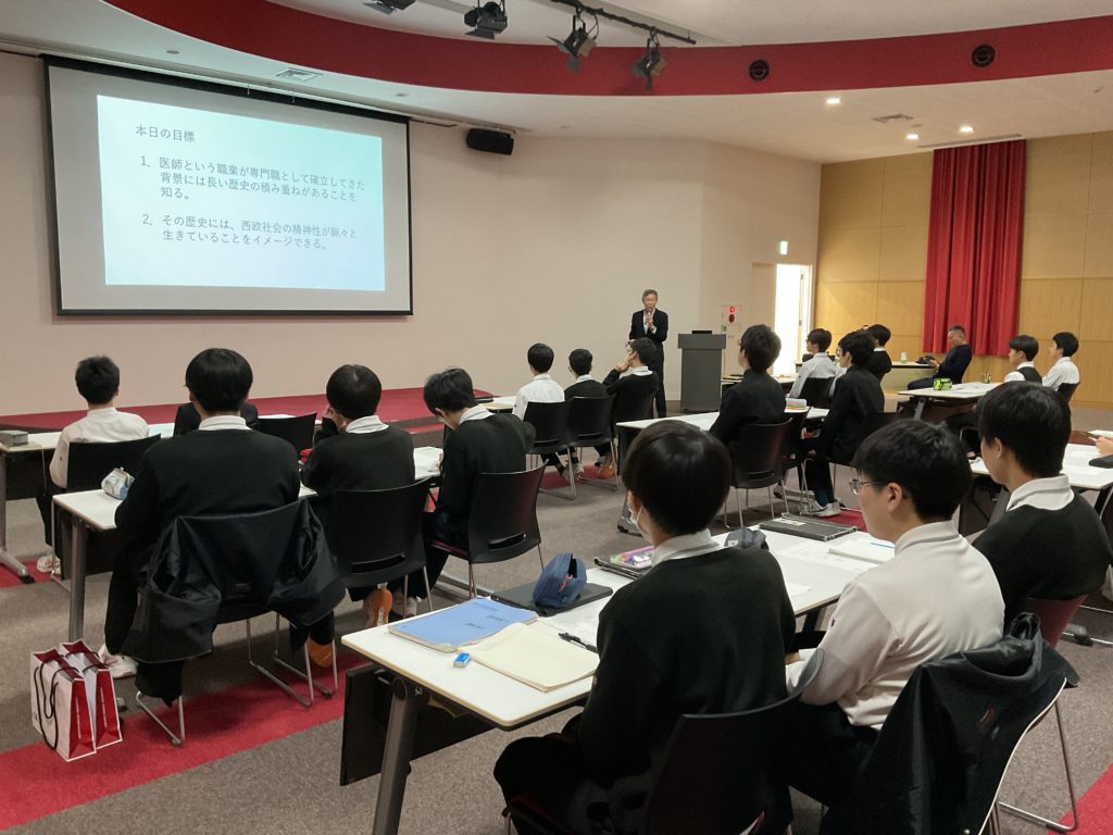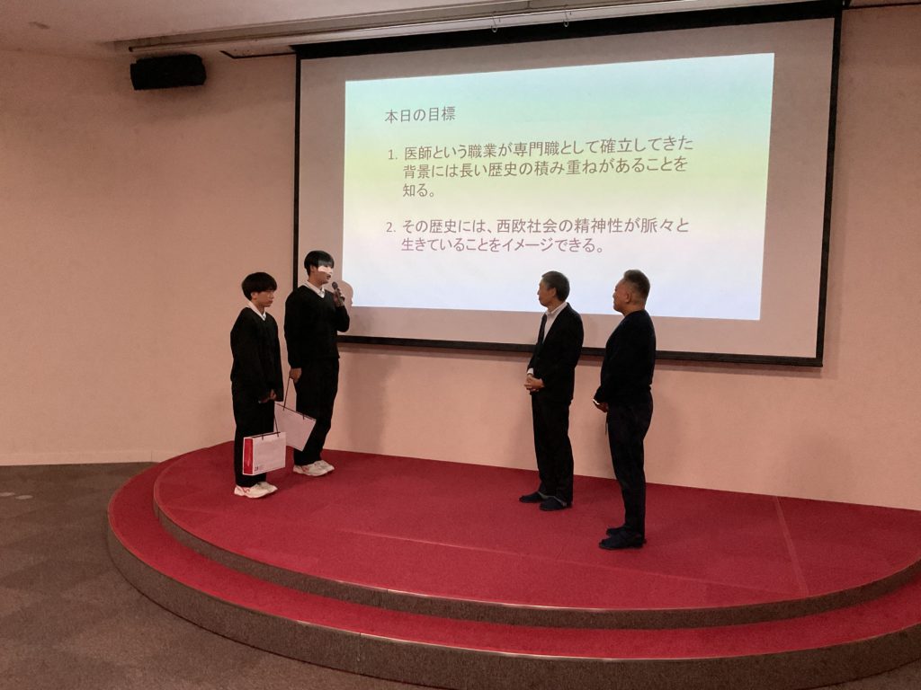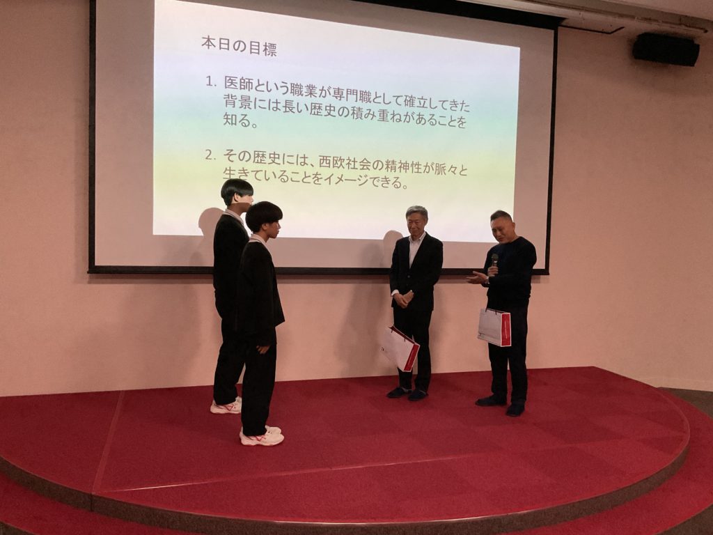 今回は医学部生が必ず学ぶ「ヒポクラテスの誓い」を紹介していただきました。この誓いに書かれている、医師に求められる特別な「志」をみんなで読み解きながら、将来どのような医師になるべきかを自分に問いかけました。