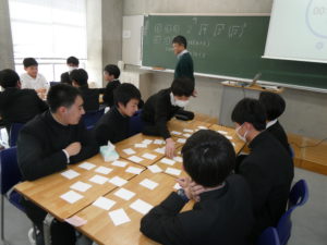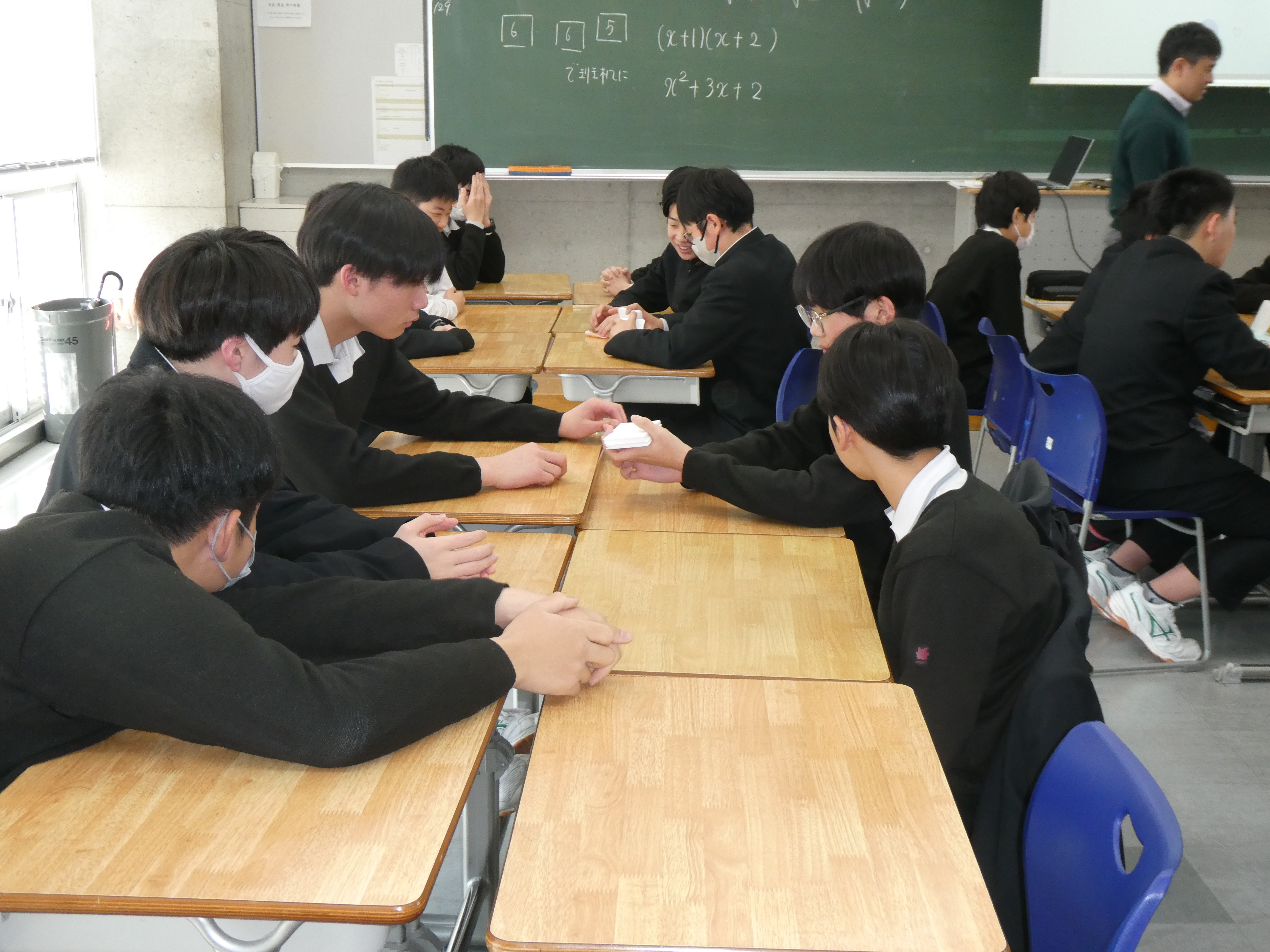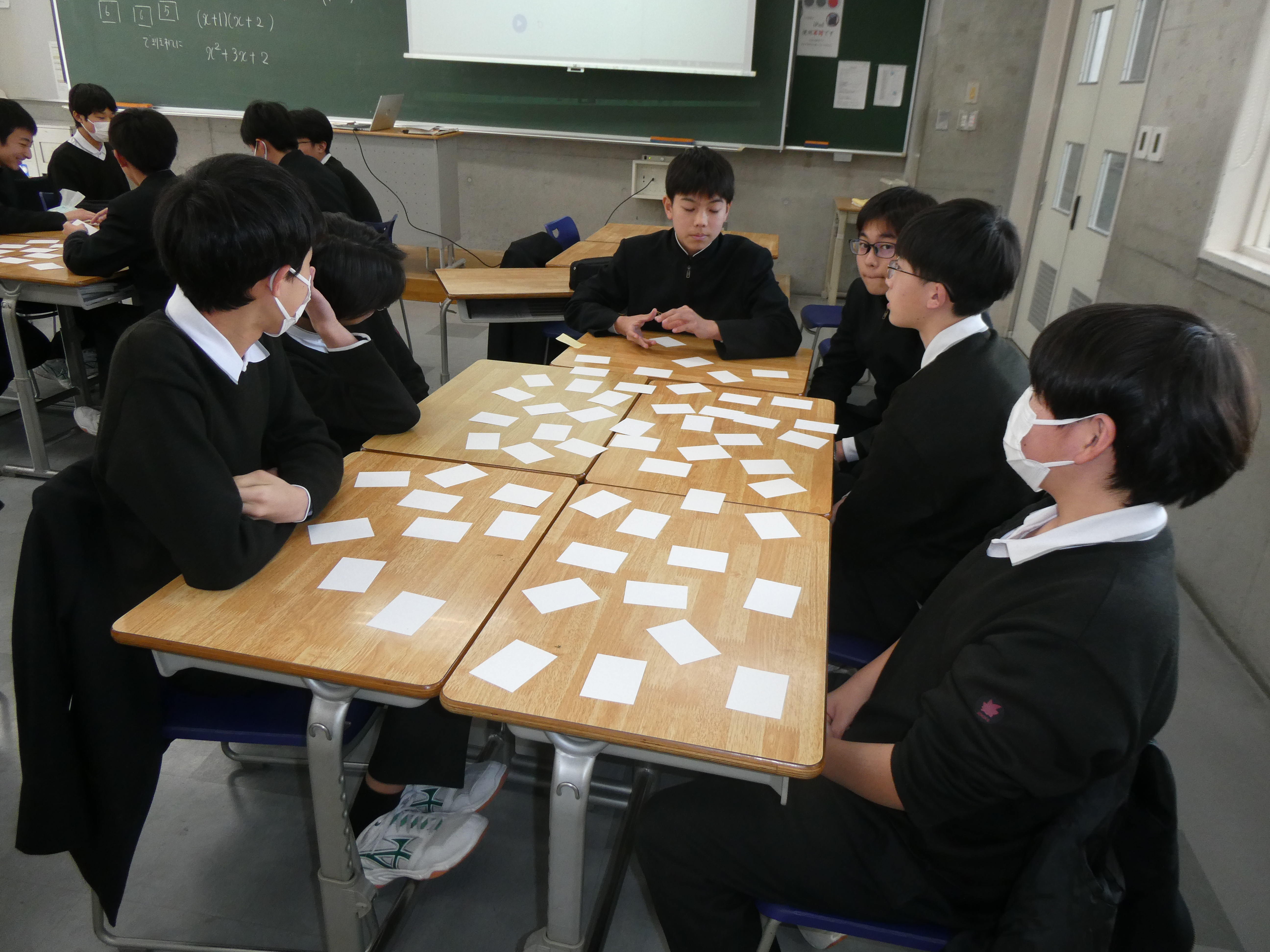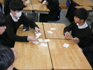 中2数学において現在平方根、2次方程式の学習を進めています。その中で数式でのオリジナルトランプを用いて「数学神経衰弱」を行いました。このトランプは例えば「2」と「√4」が同じ数となっており、通常のトランプと同じように同じ数が4つの13種類に作られています。ルールは通常の神経衰弱のものに加えて「めくった人が気づかなかった場合は気づいた人が横取りできる」など数学の勉強をしている人が有利になっています。