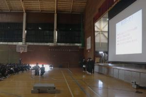 式終了後、高校生徒会執行部の生徒が、4月1日より導入された自転車交通違反の青切符(交通反則通告制度)について映像を見せながら全校生徒に向けて説明をしました。