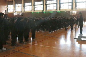 式終了後、高校生徒会執行部の生徒が、4月1日より導入された自転車交通違反の青切符(交通反則通告制度)について映像を見せながら全校生徒に向けて説明をしました。
