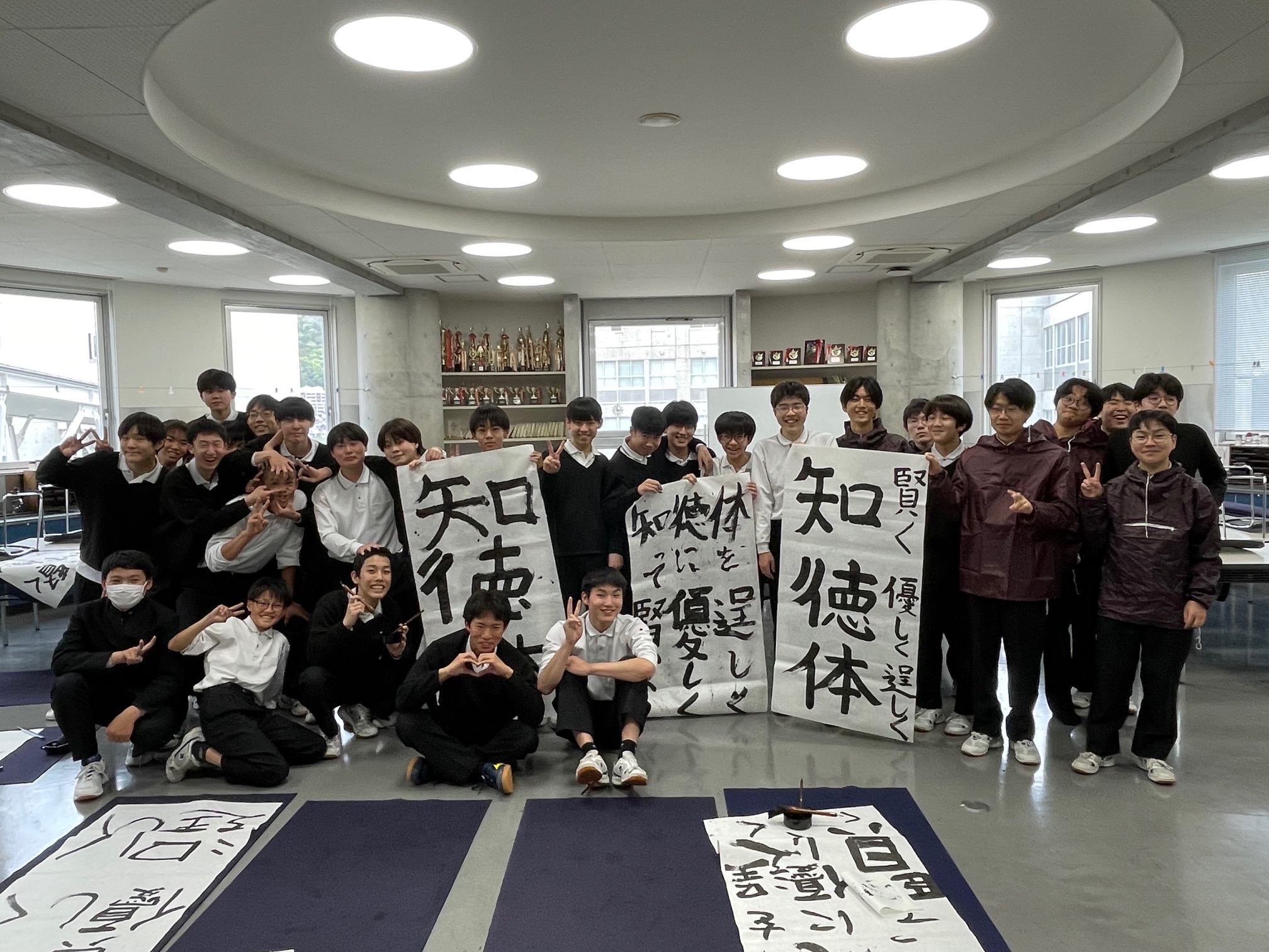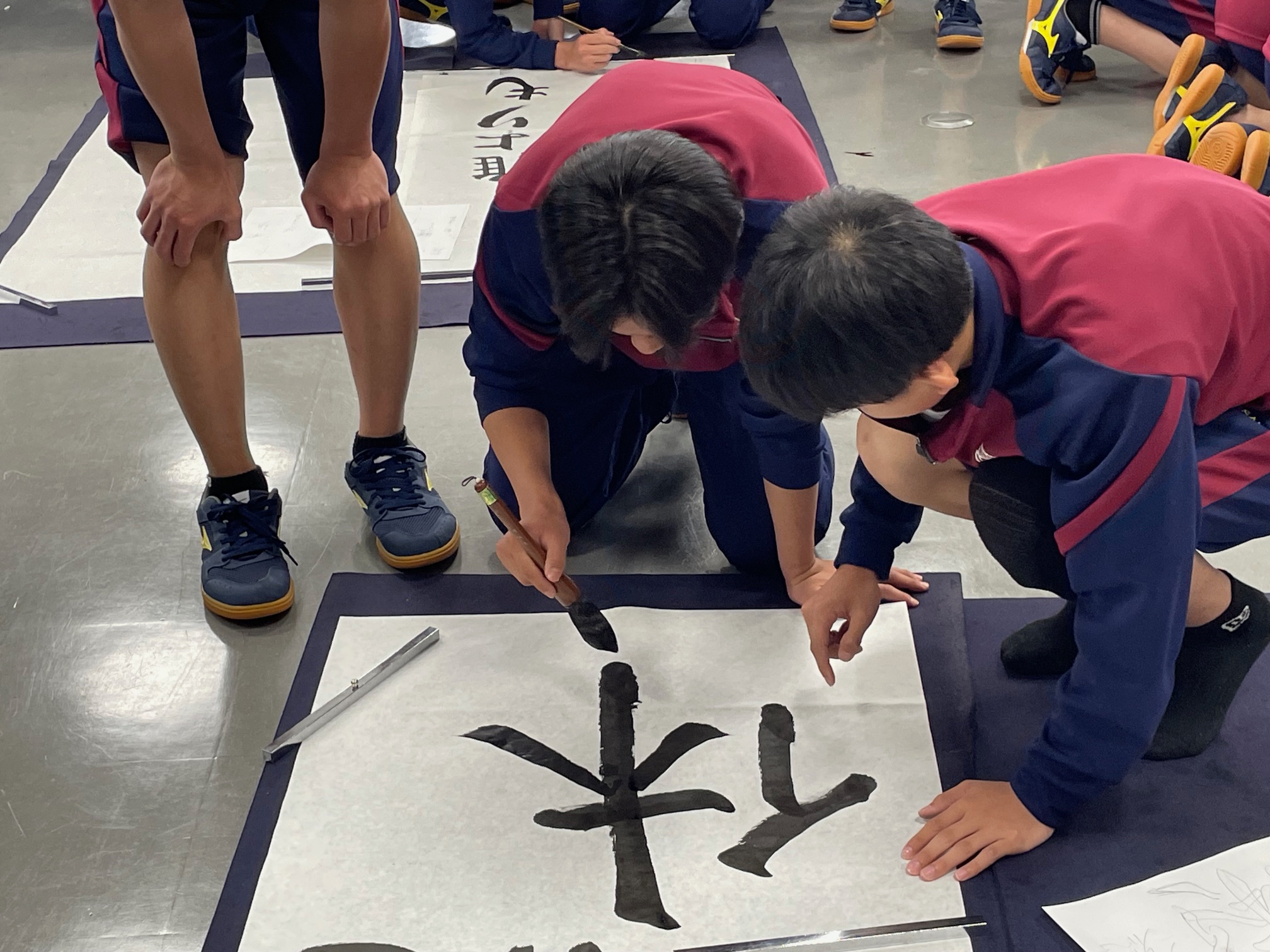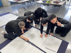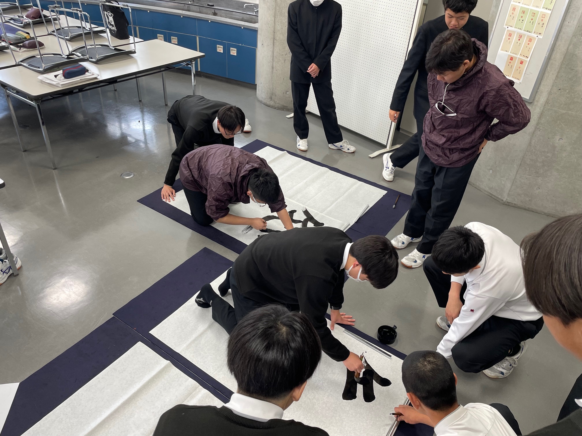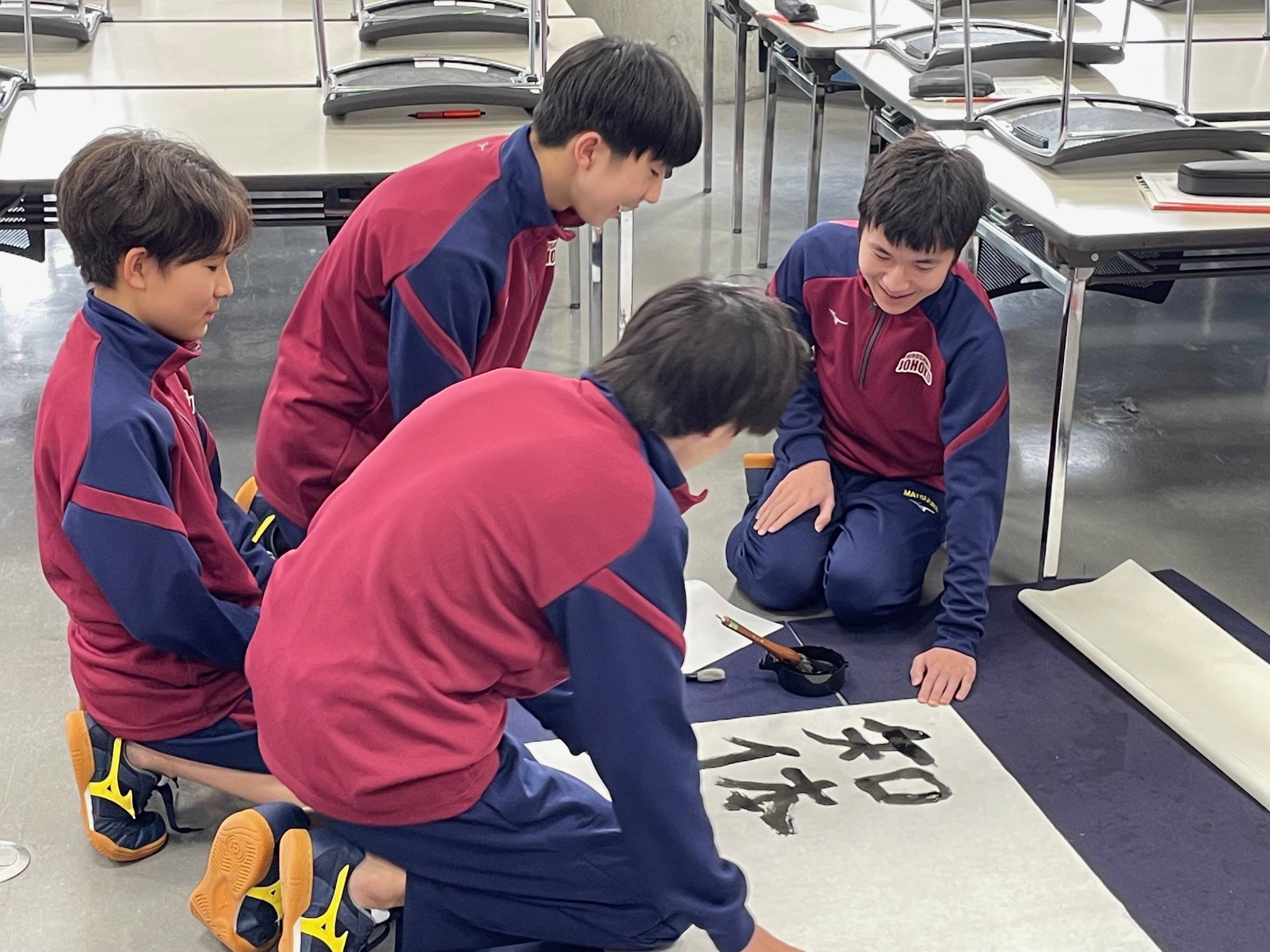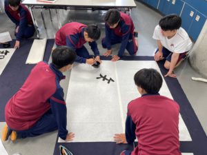 書道の初回授業では、1年間の予定、道具の確認をした後、大きな筆・大きな紙を使って、グループに分かれて作品制作を行いました。新しいクラスが始まって間もないですが、アイディアを出し合い、よく話し合いができていました。思いきって一発勝負を楽しむグループや、綿密に計画を立てるグループなど、同じ題材でもグループごとに様々な表現があり、皆楽しそうに活動していました。これから様々な学びを通して感性を磨き、芸術に親しんでほしいと思います。