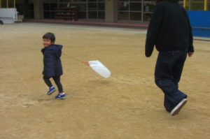 「たこたこあがれ〜♬」スーパーの袋を使って凧作りをし、園庭で凧揚げを楽しみました。あゆみ展(作品展)に向けての共同作品(だるま・メロン・イチゴ・バナナ)もクラス毎に作りました。大型絵本もお母さんから離れて見ることができるようになっています。集団の中で楽しく過ごせるようになりましたね。